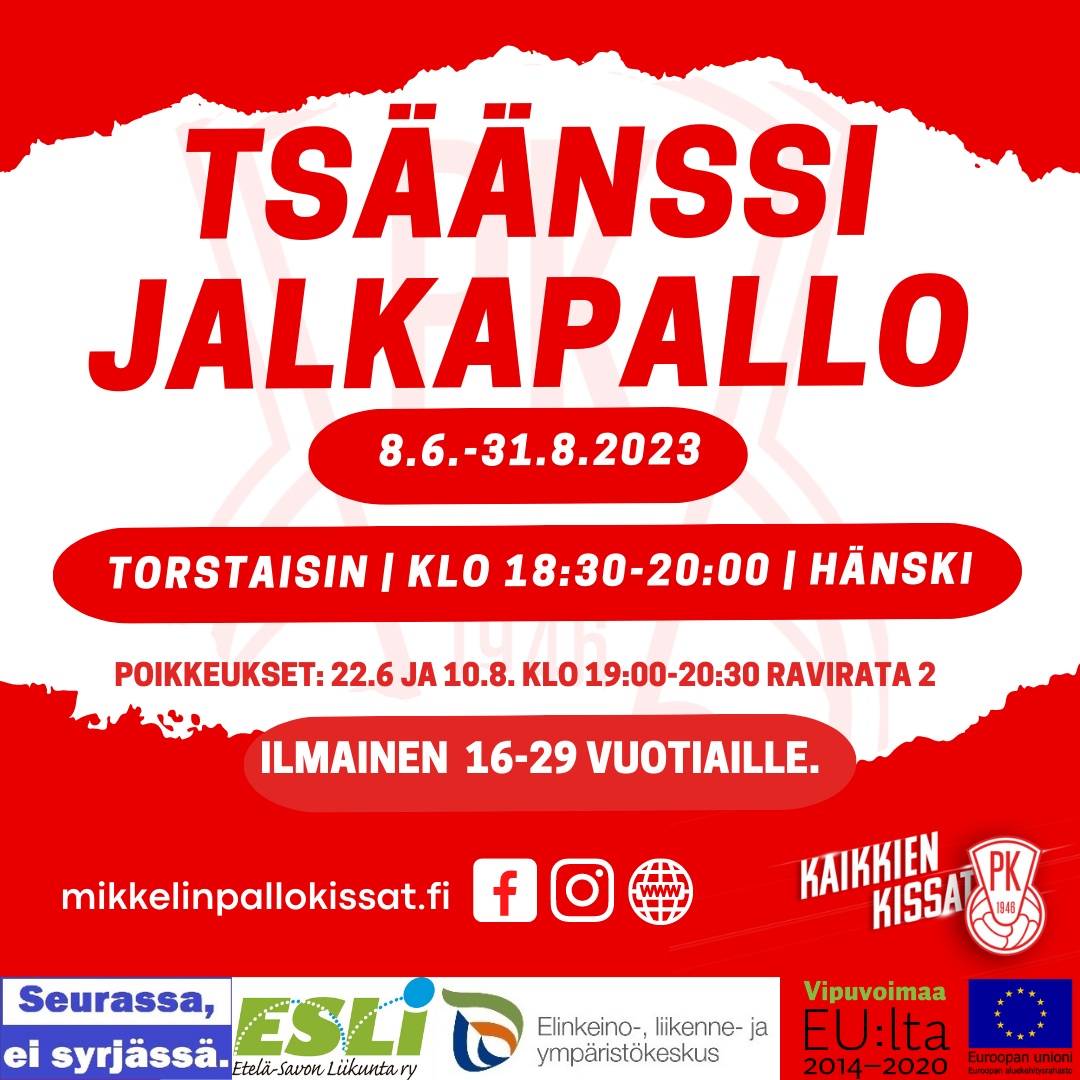 Ilmainen jalkapallovuoro jatkuu taas Torstaisin Hänskissä. Tervetuloa mukaan. Jaa sivu Share on FacebookShare on Facebook Share on LinkedInShare on LinkedIn Share on WhatsAppShare on WhatsApp Sinua voisi kiinnostaa myösMikkelin Pallo-Kissoille Läpimurtosäätiön Erityiset-apuraha26.11.2025MiPK:n Vuosikokous 4.12.202518.11.2025Joulukalenterit ovat saapuneet!6.11.2025