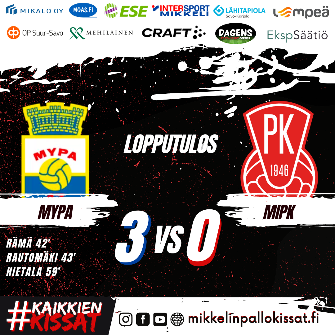 Mikkelin Pallo-Kissat matkasi Kaakon Kolmosen 16. sarjakierroksen lauantain iltaottelussa Myllykoskelle sarjaa selvästi johtavan Myllykosken Pallon vieraaksi. Kesän vääjäämätön kääntyminen syksyksi on tuonut mukanaan kokoonpanohaasteita. Varamiehisenä otteluun lähteneen MiPK:n joukkueessa pääsi tekemään Kolmosen tason debyyttinsä viisi pelaajaa, joista kolme suoraan avauskokoonpanossa. Viidestä debytantista neljä nousivat edustusjoukkueen mukaan B-junioreista. Nuoret debytantit esiintyivät ennakkoluulottomasti, mutta Pallo-Kissoista ei ollut MyPa:lle vastusta kauniin aurinkoisessa elokuun viimeisessä lauantai-illassa. Kotijoukkue hallitsi ottelua alusta loppuun, ja pisteet jäivät Saviniemeen maalein 3-0 (2-0).