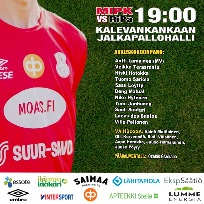 Ei avausvoittoa Pallo-Kissoille – MyPa haki pisteet Hänskistä MiPK – Mypa 0-2 (0-1) Kolmonen, Itäinen Lohko B, Ottelukierros 3/22 5.5.2022 klo 19 Hänninkenttä, Mikkeli Maalintekijät: 18’ Väinö Hietala 0-1 85’ Leevi Perkiö 0-2 MiPK-Kokoonpano: Johan Pihlajamäki (mv), Ville Peltonen, Niko Hytönen, Jiri Haikonen (C), Tuomo Sariola, Sasu Löytty, Tomi Janhunen, Sauli Suutari, Aapo…