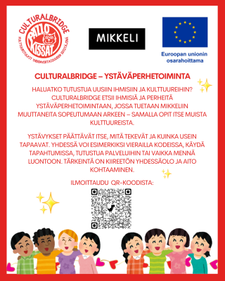 CulturalBridge kulttuurienvälinen ystäväperhetoiminta etsii ihmisiä ja perheitä toimintaan, jossa autetaan maahanmuuttaneita ihmisiä sopeutumaan Mikkelin arkeen. Samalla opitaan itse muista kulttuureista. Ystävykset itse määrittelevät, mitä he haluavat tehdä yhdessä. Samoin he sopivat yhdessä siitä, kuinka usein, miten ja missä he tapaavat. Usein kaikkein tärkeintä on kiireettömän ajan viettäminen ystävän seurassa.