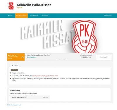 Otamme vuoden 2023 alusta seurassamme käyttöön myClub-palvelun, jonka avulla kannattajajäseneksi liittyminen tehty helpoksi. Tässä on meidän linkki myClub-palveluun, josta pääset liittymään seuran kannattajajäseneksi sekä saamaan jäsenkortin. Jäsenkortilla olet oikeutettu saamaan alennuksia mm. Mikkelin Intersporttiin. Jäsenkortti toimitetaan postissa.