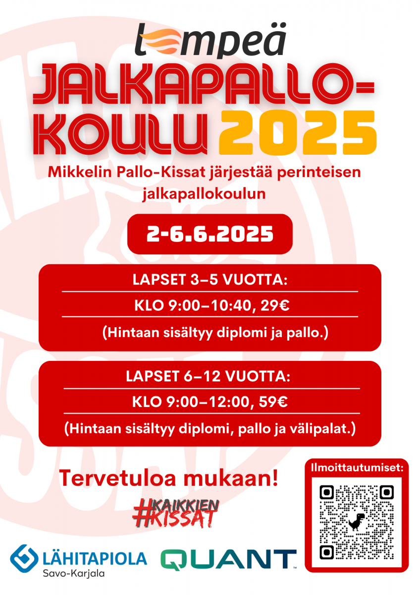 Mikkelin Pallo-Kissojen perinteinen jalkapallokoulu järjestetään tänä kesänä 2.- 6. kesäkuuta Hänskissä.