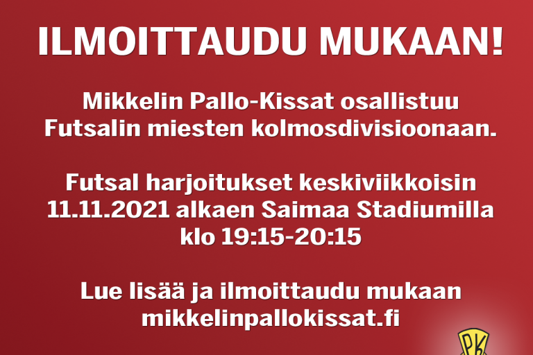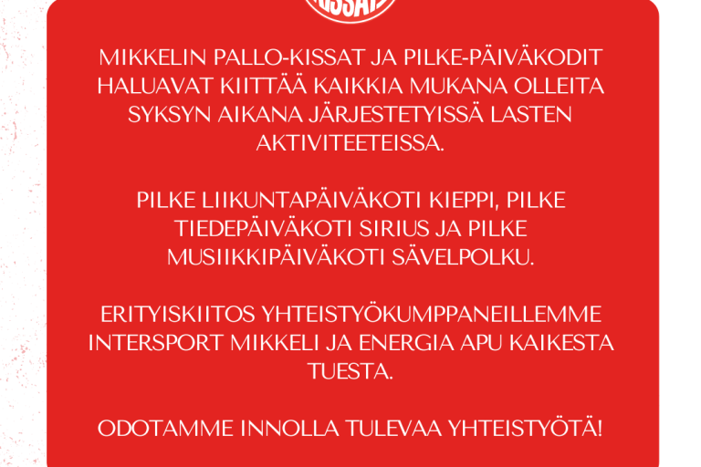 Kiitos kaudesta 2025 – Mikkelin Pallo-Kissat kiittää pelaajia, perheitä ja kumppaneita   Haluamme koko Mikkelin Pallo-Kissojen puolesta kiittää kaikkia kaudella 2025 mukana matkassa olleita – pelaajia, perheitä, valmentajia, vapaaehtoisia, yhteistyökumppaneita ja tukijoita. Teidän ansiostanne olemme kyenneet jatkamaan ja kehittämään toimintaamme vastaamaan lasten ja nuorten tulevaisuuden tarpeisiin liikunnan, hyvinvoinnin ja kasvatuksen saralla. Ensi vuonna juhlimme seuran…